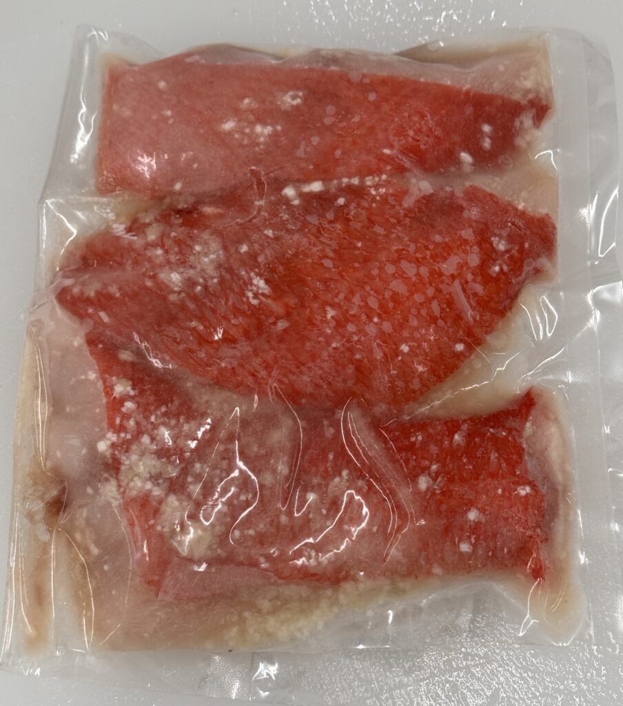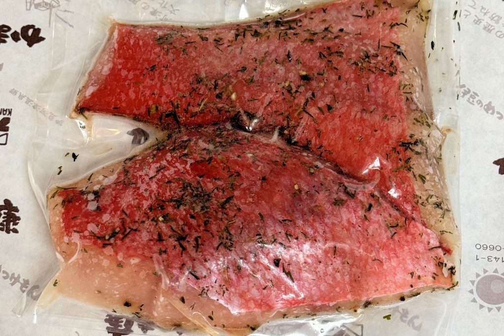 販売される商品は、金目鯛煮付け(1切)・金目鯛塩麴漬け・金目鯛ハーブソルト漬け・金目鯛カマ黒コショウオリーブオイル漬け・金目鯛切り落としです。