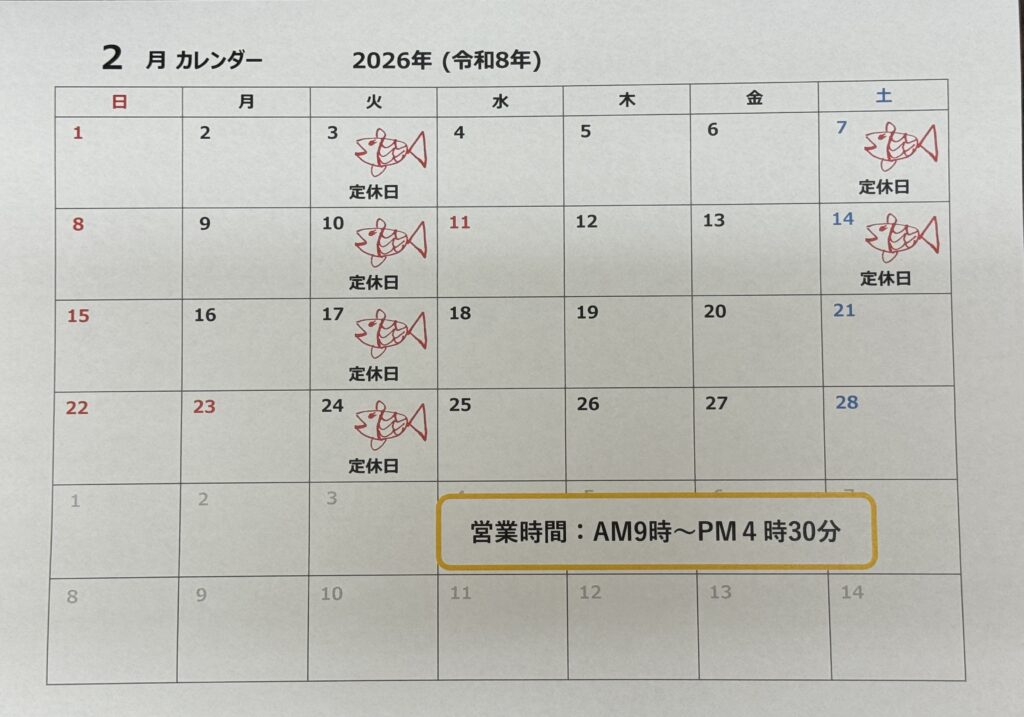 HOME お知らせ 2026年2月のお休み2026年2月のお休み2026年1月27日(火)2026年1月21日(水)お知らせ かまや水産 かまや水産本店、かま康は、3日(火)7日(土)10日(火)14日(土)17(火)24(火)をお休みとさせていただきます。 営業時間はAM9:00~PM4:30となります。 関連 コメントコメントをキャンセル